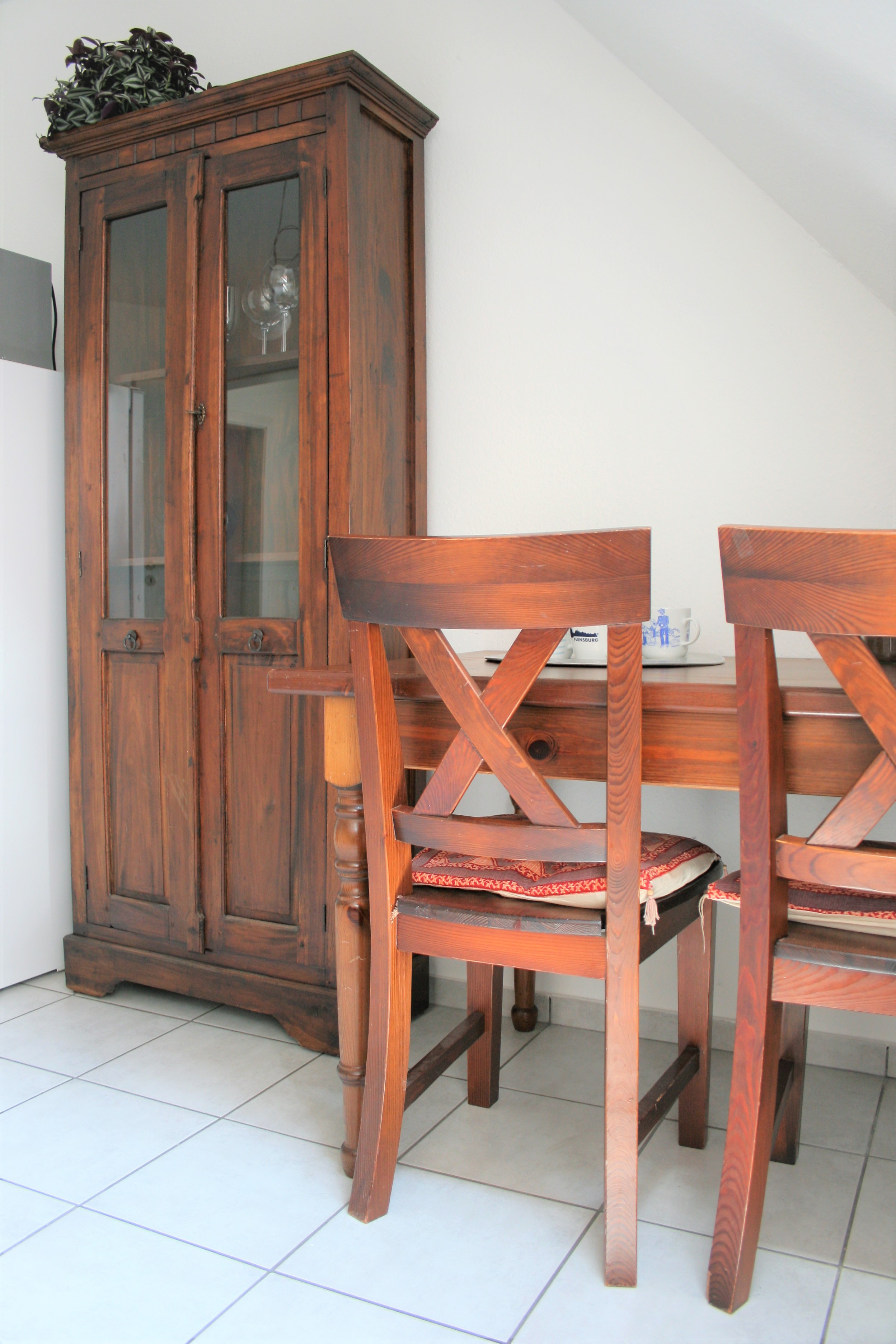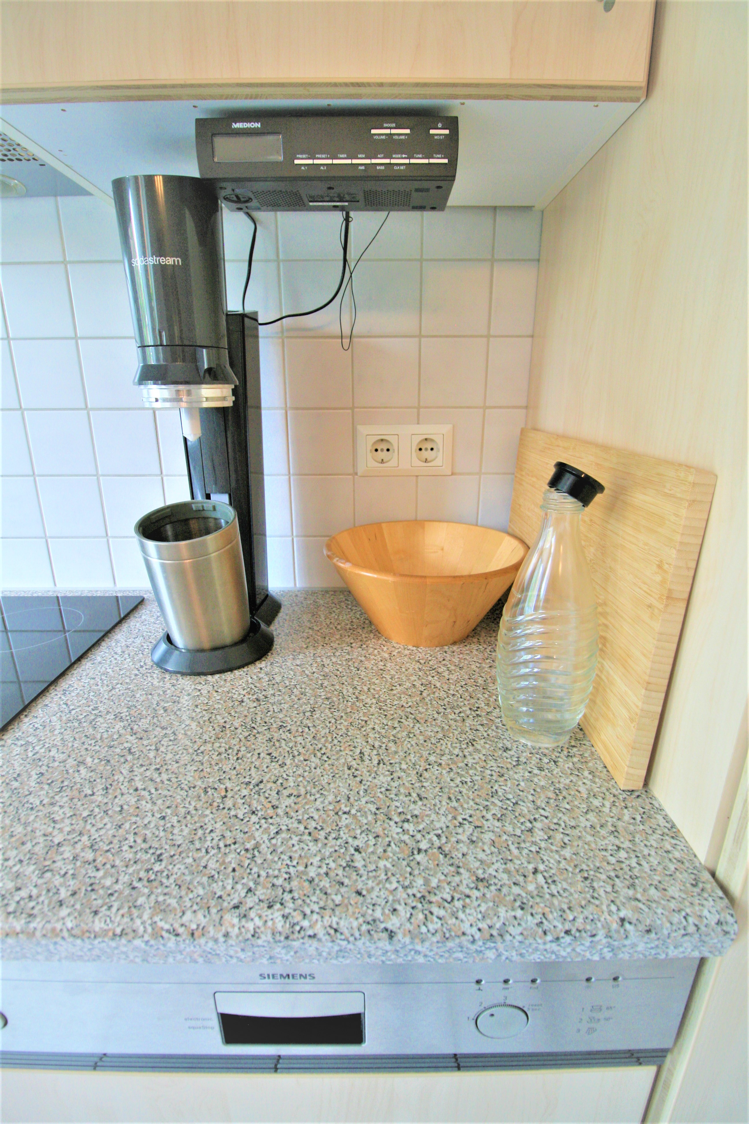 In der großen und hellen Küche befindet sich eine umfangreiche Kochausstattung. An einem großen Tisch können alle Platz nehmen und gemeinsame Mahlzeiten einnehmen. Zudem lädt die Kaffeeecke zu einer kleinen Pause ein.