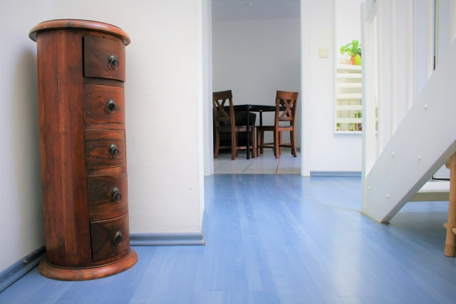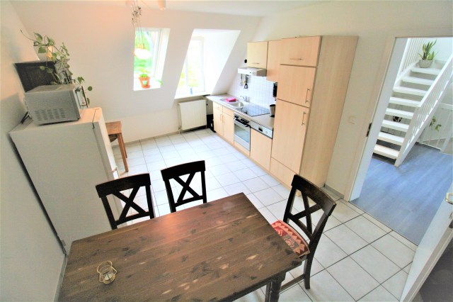 Auf zwei Etagen bietet die Ferienwohnung viel Platz für bis zu 4 Personen. Auf einer Ebene befinden sich Wohnzimmer (mit Doppelbett) , Küche und Badezimmer. Eine großzügige Treppe führt nach oben ins große und gemütliche Schlafzimmer mit Doppelbett (140×200).
